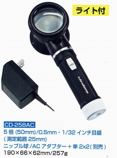 ライト付・ACアダプター 高倍率ルーペ・虫眼鏡5倍50mm 日本製 CD-258AC