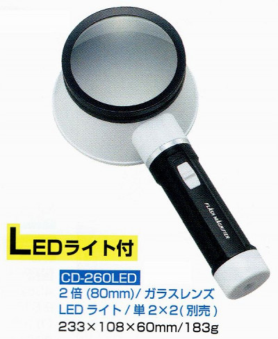 LEDライト付 手持ちルーペ・虫眼鏡2倍80mm 日本製 CD-260LED
