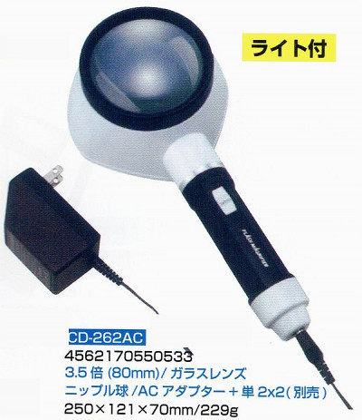 ライト付・ACアダプター 高倍率ルーペ・虫眼鏡3.5倍80mm 日本製 CD-262AC