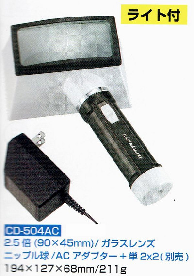 商品名:ライト付・ACアダプター 四角型レンズルーペ・虫眼鏡2.5倍45x90mm 日本製 CD-504AC