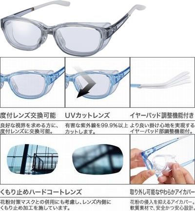 SWKA-01-CSMK 大人用花粉グラス。 PM2.5などの粉塵対策にも最適な大人用サイズの花粉グラス。 軟質素材のカバーで安全性も高く、レンズには曇り止め機能もついた花粉グラスです。 つる先も調節が可能でお顔に合わせたフィット感を得られます。